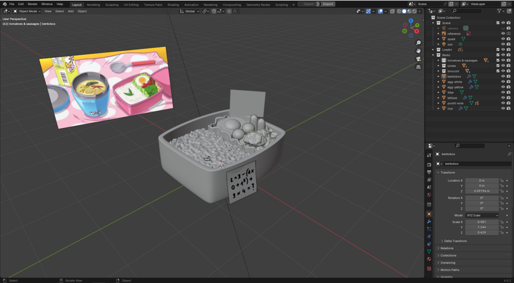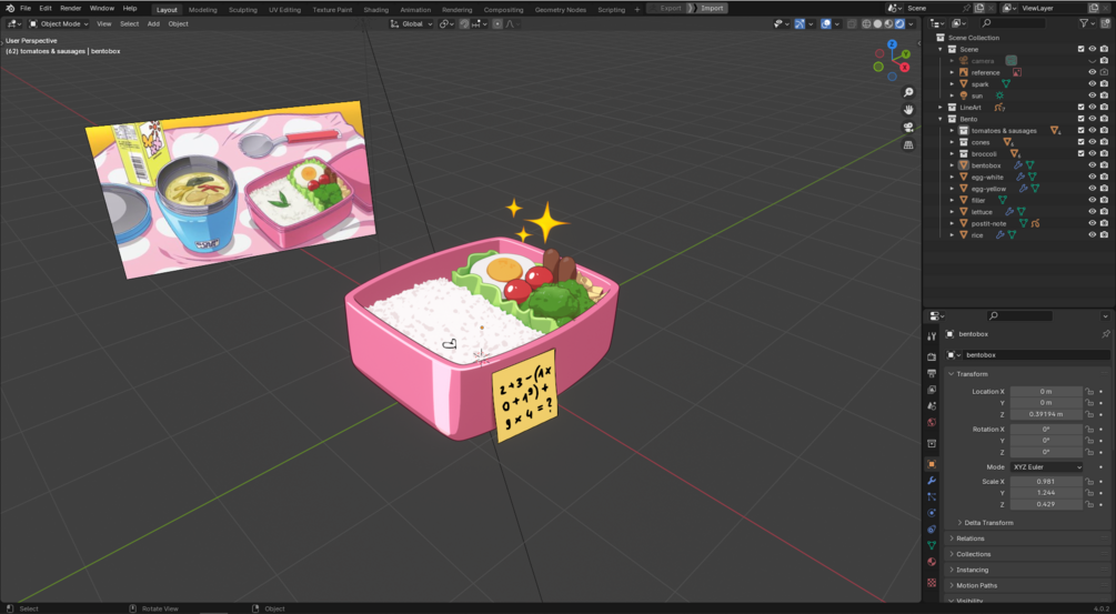 My pinterest is full of delicious looking anime food, so I thought it could be fun to recreate this Bento Box in Blender and share my project file with you! For anyone interested in learning how I made this and what goes into crafting a render like this. 😊